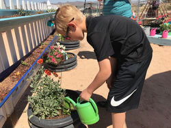 Terrific Watering sunflowers/garden and education by Gail, Don and Teresa